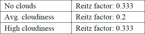 Scatter (Reitz) The Scatter factor (Reitz) indicates the percentage of solar radiation that is “lost” due to scattering effects in the atmosphere and reaches the earth’s surface as diffuse sky radiation. As a proportion, the value of the Reitz factor can only be between 0.0 and 1.0. With a complete sky covered with dark storm clouds, the Reitz factor can assume values below 0.1; it is almost dark. In high fog clouds, the Reitz factor can rise to over 0.8; despite a lack of direct radiation, it is very bright.