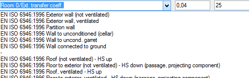Edit→ Surface transfer coeffs→... | Provides a choice of normative standard values of surface transfer coefficients designed for interior and exterior surfaces. The list offers standard value pairs from EN ISO 6946:1996 and EN ISO 13788:2002. |