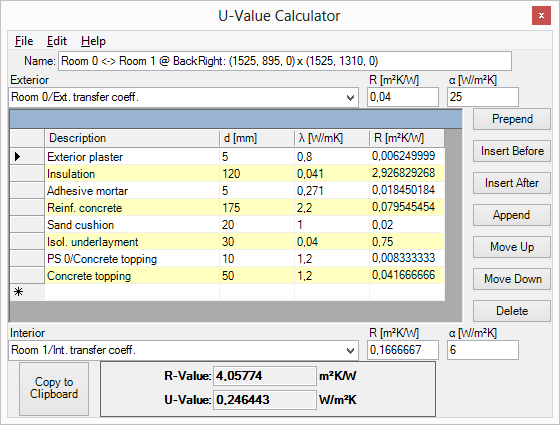 Tip: To copy the resulting U-Value to the clipboard alone use the context menu f the respective result field (you reach this menu by pressing the right mouse button over the field). |