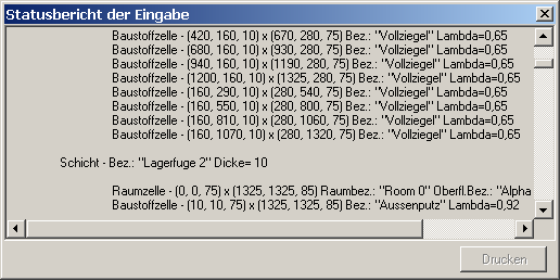 Status der Eingabe - FensterDas Fenster "Status der Eingabe" dient zur aktiven Kontrolle der gesamten Eingabe einer Bauteilkonstruktion. Das Fenster wird aus dem Hauptmenü via Dateneingabe→Status-Bericht aufgerufen.