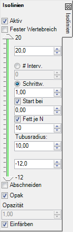 | Abschneiden | Entscheidet ob die Isolinien nur in dem gewählten Intervall Min/Max erstellt werden. Wenn abgeschaltet (Voreinstellung) werden die Isolinien im gesamten Wertebereich (aus dem Datensatz) erstellt. |