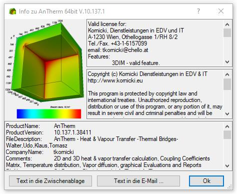 Inhalt mit den Textinhalten aller drei Informationsabschnitte. Anmerkung: Die Textinhalte werden in einem Hintergrundjob bestimmt. Bis die Daten aufbereitet sind bleiben die Kopier-Schaltflächen (Zwischenablage, e-Mail) deaktiviert. Anmerkung: Gegebenenfalls werden die Inhalte der Abschnitte (sofern der gesamte Inhalt des Abschnittes nicht angezeigt werden kann) automatisch mit ca. 1 Zeile pro Sekunde gescrollt. Um den Scrollvorgang zu unterbrechen klicken Sie mit der Maus in dem jeweiligen Textabschnitt oder auf der zugehörigen Bildlaufleiste. Siehe auch: Systemvoraussetzungen, Die Lizenzdatei AnTherm.HID, Lizenzbedingungen |
