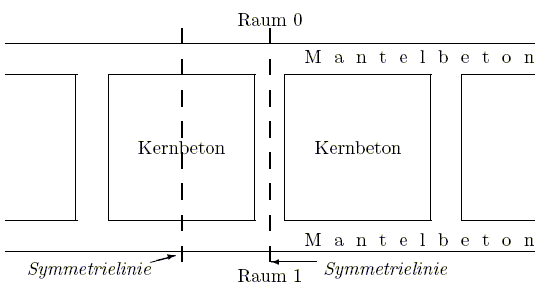 die Normalkomponente der Wärmestromdichte. Ein weiteres Beispiel soll zeigen, wie man Schnittgrenzen aufgrund vorhandener Symmetrien zweckmäßig wählen kann. Die folgende Abbildung zeigt eine (idealisierte) Mantelbetonwand.
