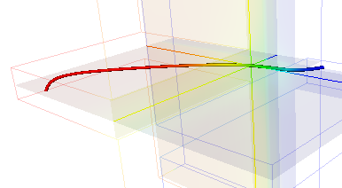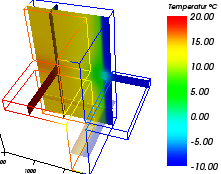 Im dreidimensionalen Fall ist vorerst die gewünschte Schnittebene, für die ein Isothermenbild erzeugt werden soll, festzulegen. Zudem besteht immer die Möglichkeit, die Temperaturverteilung an den Oberflächen in Form von Isothermen-Darstellungen zu visualisieren. Zudem kann der Temperatur-Wert an einem beliebigen Punkt der Baukonstruktion abgefragt werden. Die Festlegung der Lage des interessierenden Punkts erfolgt entweder durch Eingabe der Koordinaten im Menü "Probepunkte" oder durch entsprechende Setzung der Schnittebenen. Hierbei wird jeweils der Temperaturwert im Schnittpunkt der drei Ebenen am Bildschirm angezeigt. Eine zusätzliche Möglichkeit, grafische Information über die berechneten Temperaturen abzurufen, besteht im zweidimensionalen Fall durch Auszeichnen des Temperaturverlaufs längs der Oberfläche eines Raums. Die Kontur der Oberfläche wird hierbei in Form einer Abwicklung durchlaufen. (Achtung! Diese Option ist dzt. nicht aktiv!) Im dreidimensionalen Fall interessieren häufig die Temperaturverläufe entlang von Kanten der Baukonstruktion. Deshalb ist ein Zweig vorgesehen, der die graphische Darstellung des Temperaturverlaufs längs einer beliebigen Strecke parallel zu einer der Koordinatenachsen ermöglicht. Diese Strecken können sowohl im Inneren des Bauteils als auch auf dessen Oberfläche liegen und somit auch mit interessierenden Bauteilkanten zusammenfallen.