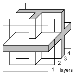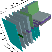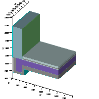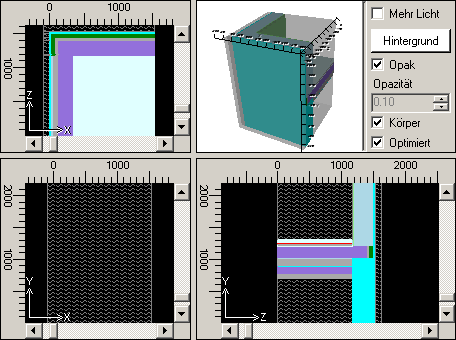 Dieser Umstand ist immer dann zu beachten, wenn - z. B. aus Gründen der Ergebnisdarstellung - zweidimensionale Berechnungsfälle in dreidimensionaler Modellierung ausgeführt werden. Anmerkung: Zur besseren Orientierung bei der Eingabe kann eine Vorlage in der Eingabeebene registriert und im Elemente2D-Fenster angezeigt werden. Anmerkung: Ein 2D Projekt dient oft als Ausgangspunkt für die Erstellung von 3D Modellen unter Zuhilfenahme diverser Konvertierungsmöglichkeiten (siehe weiter) . Schichten 3D ProjektEin Schichten 3D Projekt ist dadurch gekennzeichnet, dass die Geometrie des Bauteils durch die Eingabe der ebenen Schnitte erfolgt (ident zu einem 2D Projekttyp). Diese Projekttype wird typischerweise zur Modellierung einer punktuellen Wärmebrücke benutzt.