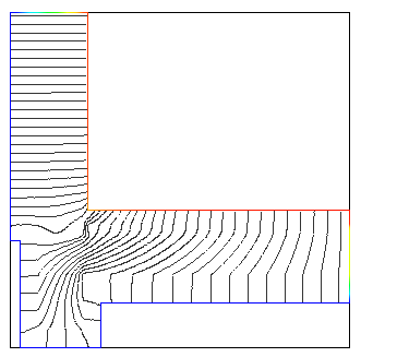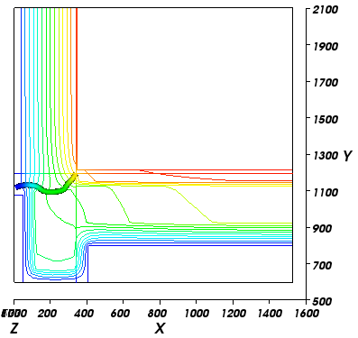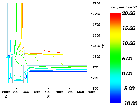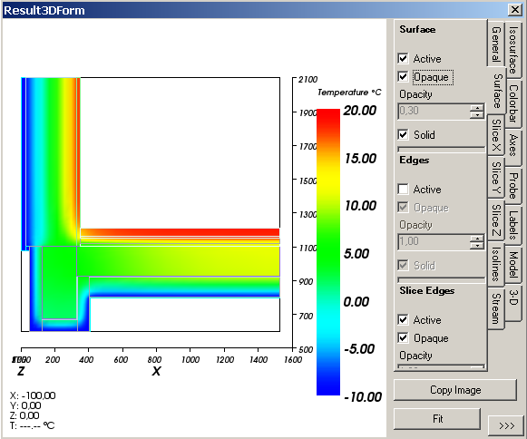 Um das Bild für weitere Bearbeitung über die Zwischenablage verwenden zu können, benützen sie entweder den „Bild kopieren“ Knopf oder wählen über das Hauptmenü „Bearbeiten→Kopieren“. Beschriftete Isolinien (Isothermen)Als nächstes soll eine Visualisierung der Temperaturverteilung in Form von beschrifteten Isothermen auf der Z-Ebene generiert werden. . Da die Ebene das Innere der Konstruktion schneidet, würden die Isolinien unsichtbar sein, wenn die Oberfläche nicht deaktiviert wäre. Aus diesem Grund deaktivieren sie die Oberfläche in dem Reiter „Oberfläche“. In dem Reiter “Schnitt Z” wählen sie den Wert 500. . Die Ebenen-Oberfläche ist auch gefärbt. Um die Isothermen darzustellen, machen sie die Ebene (Schnitt Z) vollkommen transparent, indem sie die Opazität auf 0.00 stellen. Im Reiter “Beschriftung” können sie Abstand und Größe festlegen. Um den Aufbau der Materialien im Modell - im Moment nur als Linien dargestellt - sichtbar zu machen, wählen sie im Reiter „Modell“ die Option Einfärben im Bereich Modell Schnitte.