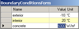und das ist, was als Eingabe vom Programm benötigt wird – und es ist derselbe Wert, welcher zuvor oben berechnet wurde. Um die Bedingungen für die Untersuchung zu ändern, aktivieren sie das Fenster „Randbedingungen“ (wenn nicht sichtbar, wählen sie im Menü Ansicht→Evaluierung und Berichte→Randbedingungen). Bewegen Sie den Mauszeiger zum Eingabefeld der Heizquelle (die Temperatur Werte können bei belassen werden) und geben Sie den neuen Wert für die Leistungsdichte [W/m3] an: