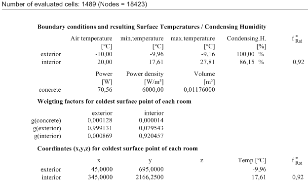 Bestätigen sie die Eingabe mit “Anwenden” Numerische ErgebnisseDa die Leitwertmatrix und Verteilungsfaktoren der Wärmequelle für beliebige Evaluierungsbedingungen gleich bleiben, müssen diese nicht erneut gedruckt werden. Der Ausdruck des Ergebnis Berichts zeigt in jedem Fall die neuen Daten: