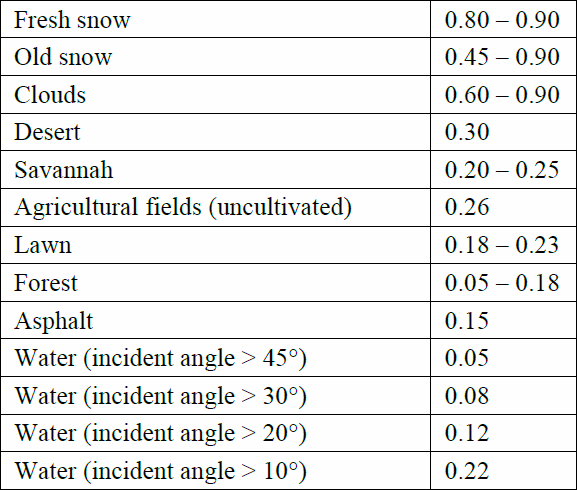 Albedo The Albedo number indicates the reflection of the global radiation. It corresponds to the ratio of reflected to incident radiation intensity or the ratio of up- and downward-directed radiation flux densities. The average Albedo of the earth is 0.3. The Albedo can have values below 0.1 on dark surfaces (e.g. dark asphalt) and around 0.5 on light surfaces (e.g. snow conditions or desert areas with light sand).