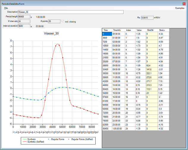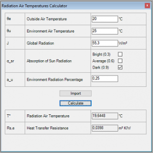 The radiation air temperature is a fictional temperature which is influenced both by the solar radiation and the long-wavelength radiation exchange. If an AnTherm user specifies the radiation air temperature instead of the exterior air temperature, this means that not only the diurnal solar radiation is considered but also the long-wavelength radiation exchange between the exterior surfaces of the exterior building components on the one hand and the sky and the terrestrial environment on the other. The use of the radiation air temperature implies that the absorption and reflection processes occur at the exterior building component surfaces. The used method is capable of exactly reproducing these processes. Until now, the user specified outside air temperatures in AnTherm as exterior boundary conditions. In the stationary case, this is a single value. In the instationary, periodic case this is the 24 values of a diurnal cycle.